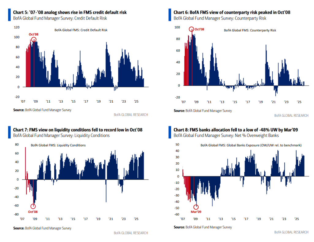 更重要的是,当前的信贷违约风险、交易对手风险和流动性状况等FMS指标,已经开始显现出类似2007年中期(即2008年全面危机爆发前夕)的早期恶化迹象。信贷风暴的阴云,正在华尔街上空聚集。