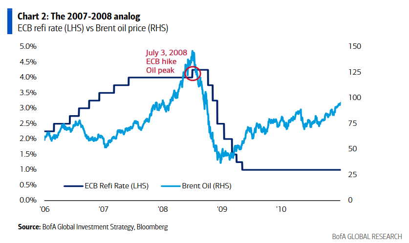 当年油价从70美元/桶飙升至140美元/桶,同时次贷危机(法国巴黎银行/北岩银行/贝尔斯登)开始震荡。2008年7月3日油价见顶,同一天欧洲央行加息25个基点,这被视为史上最大的政策失误之一;74天后雷曼兄弟破产,信用危机压倒了油价(油价暴跌至40美元/桶)。